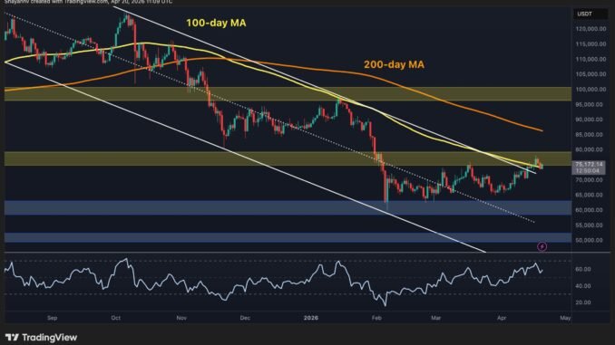 Things have been quietly shifting in Bitcoin’s market structure over the past two weeks. After spending the better part of Q1 2026 in a relentless grind lower, BTC is now trading around $75.2k, above the upper boundary of the descending channel and at the $75k–$80k key resistance band. The question is no longer whether a recovery is underway, but whether it has enough structural backing to become something more durable.