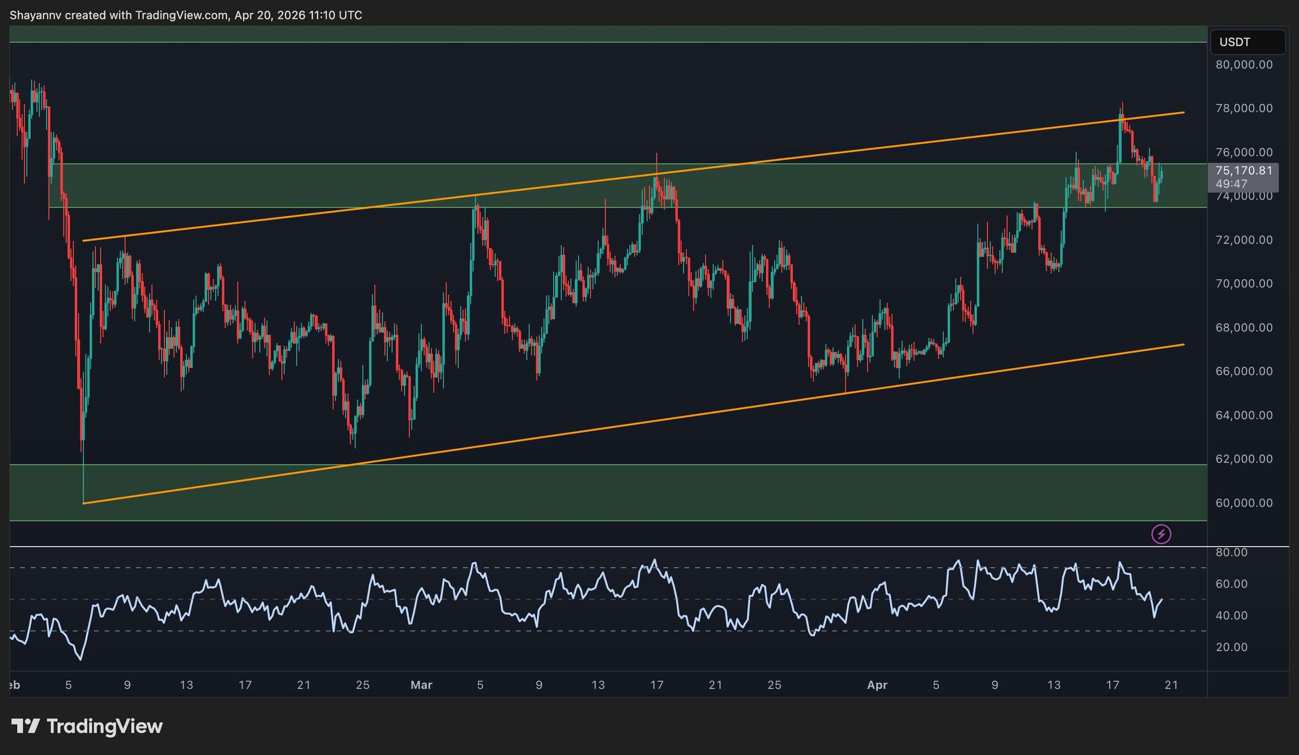 The ascending channel from the February lows has done its job. It has been providing a rising structure of higher lows that gradually walked price from the $60k area all the way up to the channel’s upper boundary near $77k–$78k, which BTC tagged earlier this week before pulling back. The price is currently consolidating around $75.2k, sitting just inside the $74k–$76k resistance-turned-support level following the rejection.