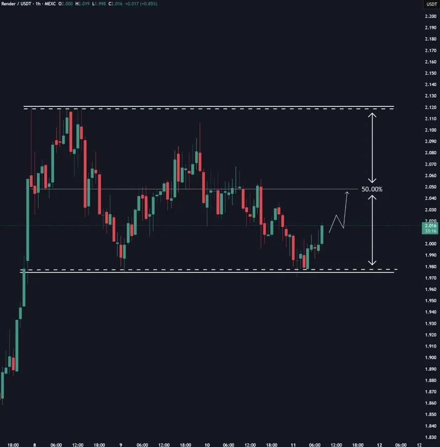 Moreover, another analyst, Crypto Chiefs, mentioned that RENDER continues trading within a horizontal range. Support has been observed at $1.97-$1.98. Resistance has been identified at $2.11-$2.12, creating a distinct upper boundary for the coin.