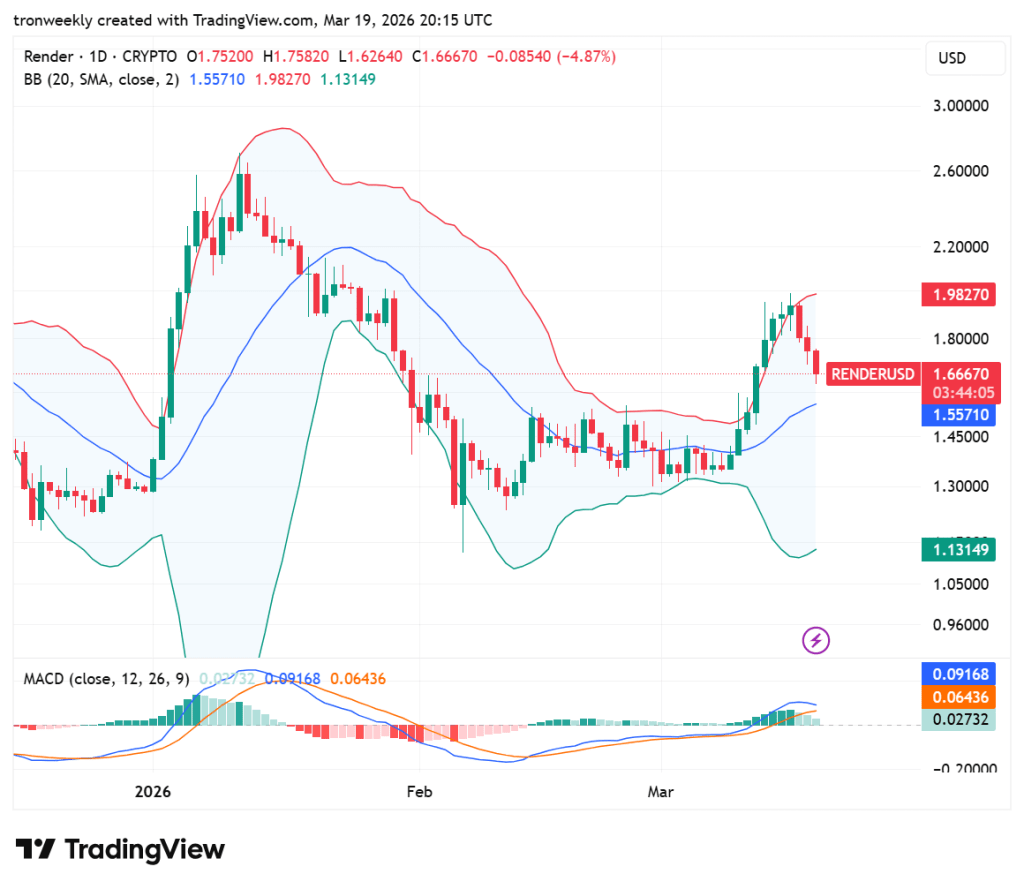Following its recent run to the $1.98 upper Bollinger Band, the token price is currently retracing. It’s currently at $1.66, down by 4.87%, and touching its $1.55 middle moving average in search of new short-term support.