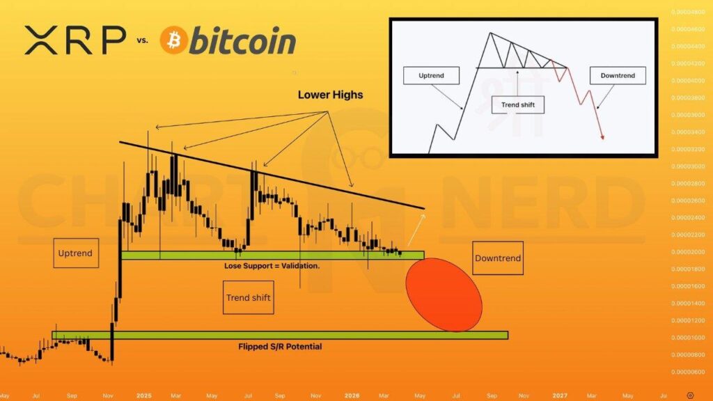 However, the analyst also warned that the token could still face additional downside in the near term if key support levels fail. A potential retest of the $0.80 to $0.70 range, he noted, would align with the current structure of the XRP/BTC trading pair.