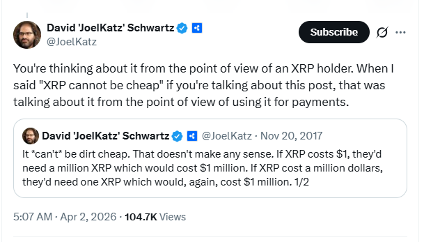 He pointed to an earlier 2017 explanation to illustrate his reasoning. In that post, Schwartz argued that the absolute price of XRP is less important than the value being transferred in a transaction.