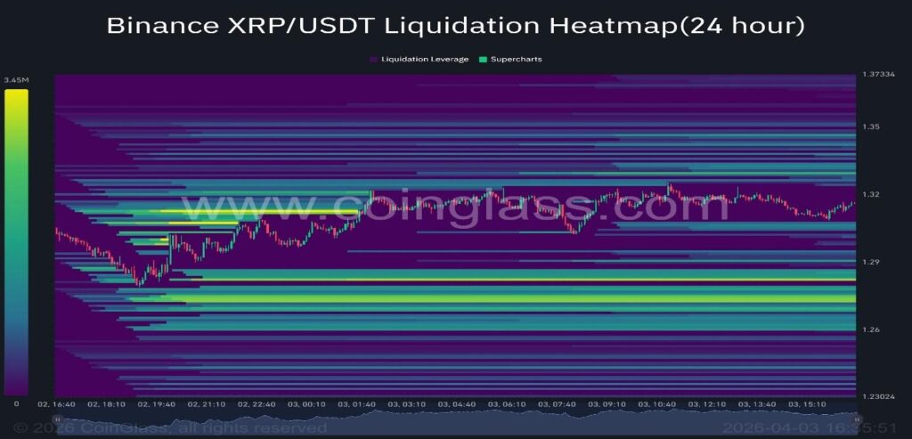 Moreover, analyst Xaif Crypto pointed to XRP’s liquidation heatmap, highlighting two large liquidity clusters near $1.28 and $1.35.
