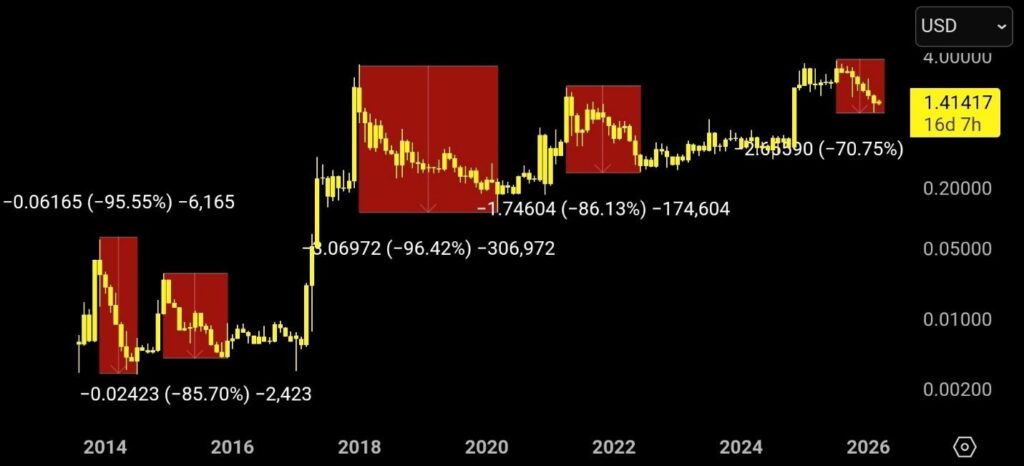 “For reference, including 2026, $XRP has only corrected deeper than 70% five times throughout its entire history,” he stated, emphasizing that each of those prolonged bearish phases eventually preceded strong rebounds.