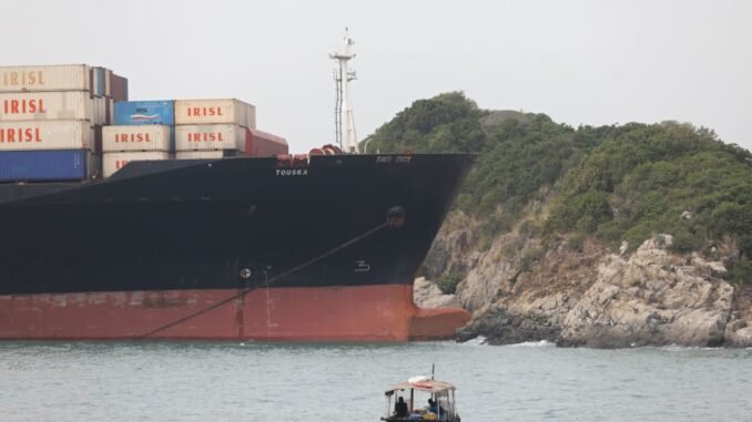 File photo: Cargo ship Touska, which was fired upon and disabled by the U.S. Navy, before being sized by Marines. Trump said Sunday that the USS Spruance intercepted the Iranian ship, the Touska, and “gave them fair warning to stop.”