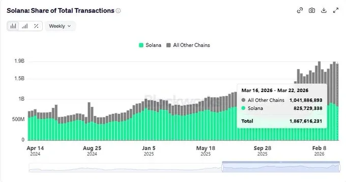 Solana (SOL) operates at a rapid pace because it completes more transactions than all other blockchains combined. The network achieved its peak transaction volume when it processed 825 million transactions between March 16 and 22 in 2026. 44% of blockchain activities occur within this metric.