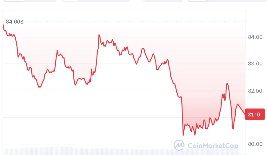 At the time of writing, Solana (SOL) is trading at $81.10, recording a 24-hour trading volume of $7.13 billion and a market capitalization of $46.46 billion. The token has declined by 3.53% over the last 24 hours, reflecting broader weakness across the crypto market.