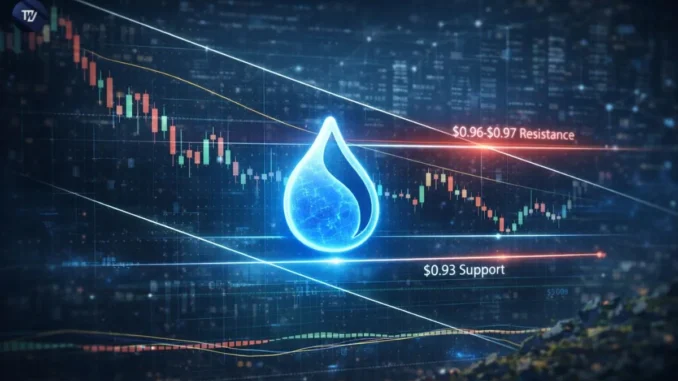 Key technical levels remain clearly defined. Resistance is located at $0.96–$0.97, where repeated rejections have occurred. Support is established at $0.93, while a deeper demand zone sits near $0.90–$0.91.