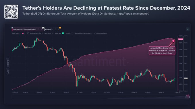 Data from Santiment shows a rare shift in stablecoin behavior, with Tether wallets on Ethereum dropping by 72,841 addresses in just 48 hours, a 0.54% decline.
