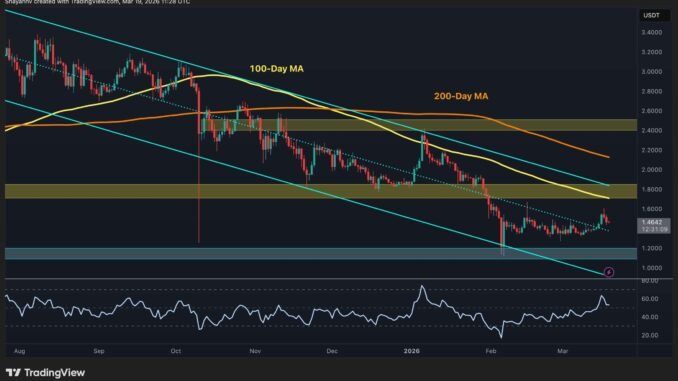 That leaves XRP in a tricky spot. The current move looks constructive, but it still resembles a relief rally inside a larger downtrend rather than a clean breakout. If buyers can force a reclaim of the $1.75 to $1.80 region, the door opens toward the much heavier $2.40 to $2.50 resistance area. But the price would also need to climb above both the 100-day and 200-day moving averages to reach this area. Until then, the bounce is not decisive.