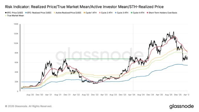 Glassnode’s latest Risk Indicator chart overlays four key on-chain price models against the Bitcoin spot price. Together, these models reveal where the market stands relative to the cost basis of different investor cohorts.