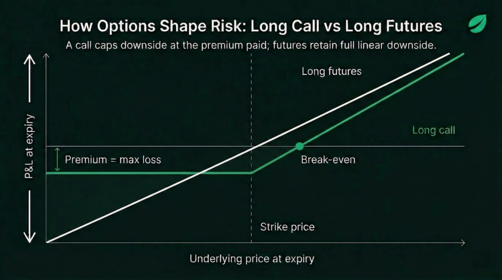 That asymmetry is what makes options categorically different from spot and futures. Spot contracts provide exposure. Futures give linear leveraged exposure. Options give non-linear exposure, i.e. the ability to shape a payoff profile in advance, defining what a position returns under different market conditions.
