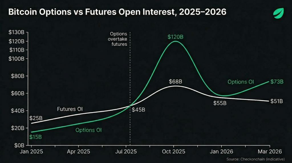 The most telling structural signal is the shift in overall open interest. According to Checkonchain data, bitcoin options open interest moved above futures open interest in July 2025, reaching roughly $73 billion against futures’ $50 billion by mid-March 2026. What is most interesting is not the crossover itself but that options open interest has remained above futures open interest throughout one of Bitcoin’s most volatile stretches since 2022.