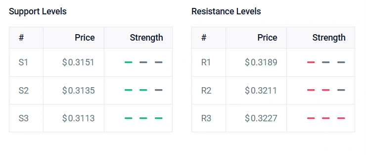 The key levels show tight boundaries. Support has three levels which are $0.3151 and $0.3135 and $0.3113. The resistance levels of the system exist at $0.3189 and $0.3211 and $0.3227. The price needs to break through resistance because this will create a path which leads to the $0.3450 target.