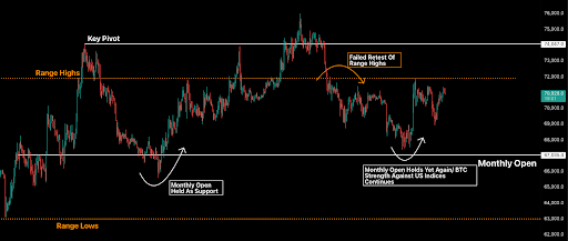 In relative terms, the S&P 500’s move was considerably stronger than bitcoin’s, reflecting how far equities had already weakened before bitcoin bottomed first, consistent with our earlier thesis on relative strength. On Tuesday, Iranian state media denied that any negotiations had taken place. Bitcoin barely flinched initially, holding above $71,000 before retracing to test sub-$70,000 demand levels once more, then resolving higher.