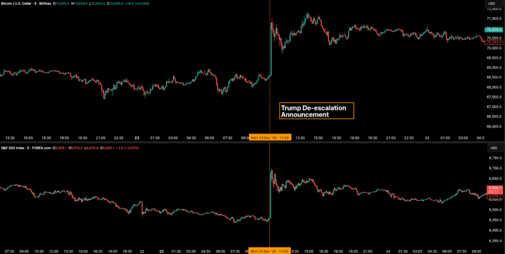 On Monday, President Trump announced a five-day postponement of planned strikes on Iranian power plants. Trump also underscored “very good and productive” conversations towards a “complete and total resolution.” Bitcoin surged 4.8 percent to an intraday high of $71,811, oil futures collapsed nearly ten percent, and Brent retreated from $112 towards $102, while the S&P 500 rose 3.8 percent.