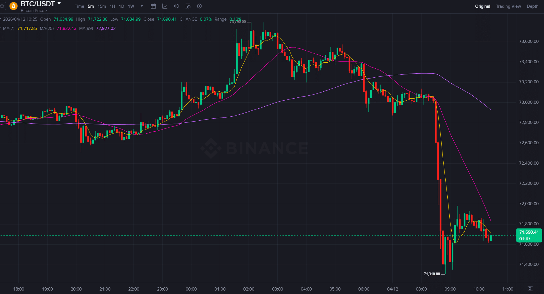 Bitcoin slid 2% on Saturday evening, dropping from above $73,000 to around $71,310, after US and Iran failed to agree on terms during high-stakes negotiations in Islamabad, Pakistan.