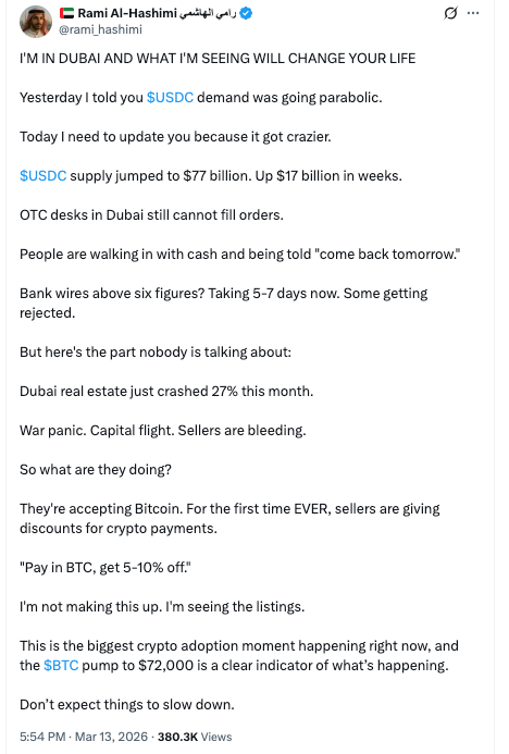 While some of the analyst’s claims appear exaggerated, there is some truth to them, as the UAE real estate market is down 10-15% amid investor panic, with no end to the war in sight. Some are liquidating/selling their assets at a discount and paying hundreds of thousands of dollars to flee via Oman. There is also a lot of excess Gold flooding the Gulf countries’ market, and the precious metal is also being sold at a discount. All of these variables point to increasing adoption of stablecoins like USDC.