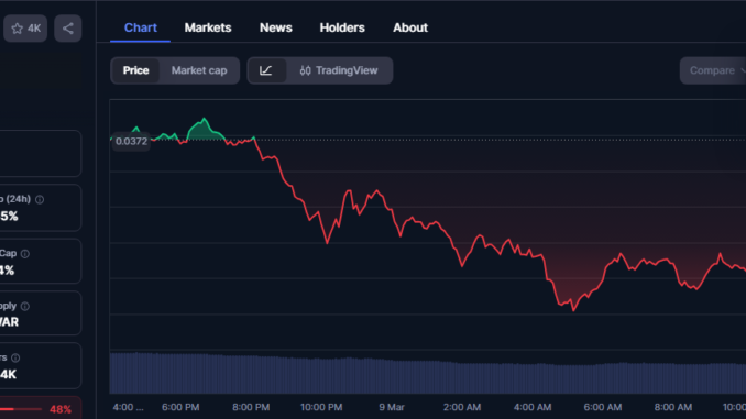 According to data from CoinMarketCap, WAR fell from an intraday peak above $0.60 to around $0.028 during the selloff, Monday.