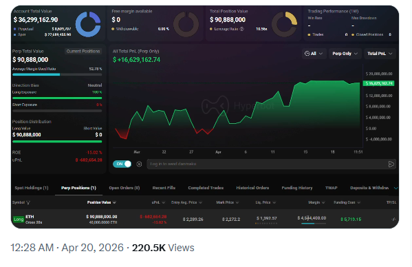 Furthermore, analyst Gordon, founder of Crypto Crib, noted that a whale recently opened an aggressive $90.9 million long position in ETH using 20x leverage. This particular trade has apparently been profitable in the past, bringing in about $16.6 million over the last few months.
