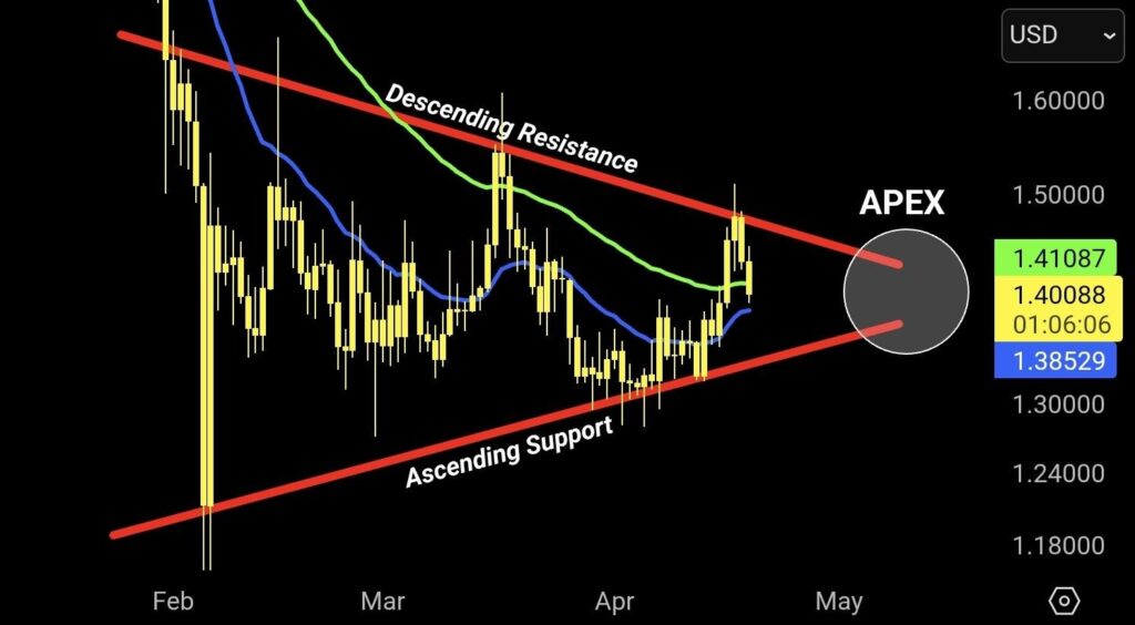 According to his analysis, price action is steadily converging towards the apex of the pattern, a zone that typically precedes a breakout or breakdown as volatility compresses.
