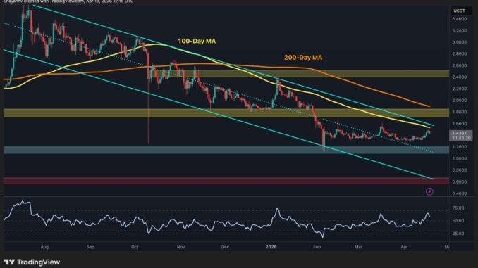 XRP remains firmly inside its descending channel on the USDT pair, with the 100-day MA now declining toward approximately $1.50 and the 200-day MA sitting near $1.90. Both moving averages are compressing downward and forming an increasingly tight resistance ceiling just above the current price. The convergence of the channel’s upper boundary with the 100-day MA around $1.50–$1.60 makes that zone the first real test for buyers.