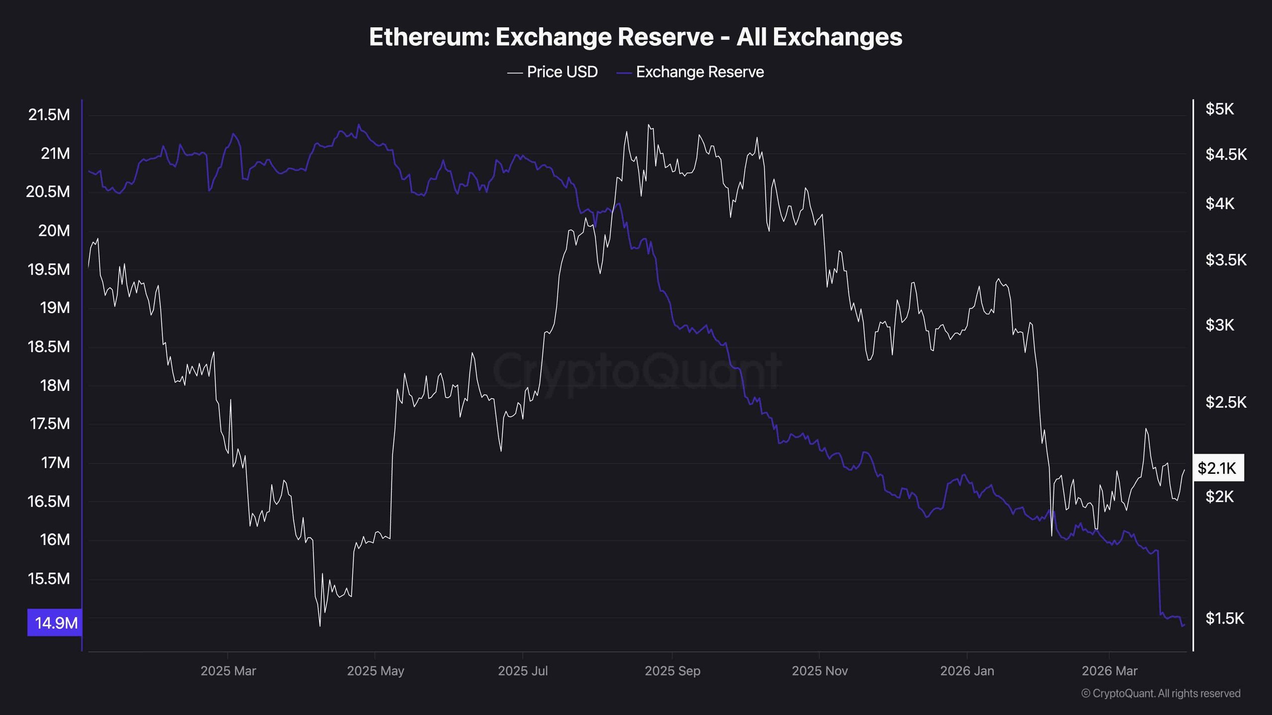 Ethereum’s exchange reserve has fallen to approximately 14.9M ETH. This is the lowest level recorded over the past year, and the metric is continuing a decline that accelerated sharply through late 2025 and into 2026. The drawdown from the mid-2025 peak near 21M ETH has been steep and consistent. It reflects a sustained trend of holders withdrawing ETH from exchanges into self-custody.