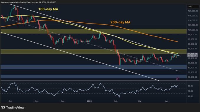 Bitcoin is trading around $74.6k, posting one of its more meaningful recovery moves in recent weeks. The market is responding to improving geopolitical sentiment surrounding the US-Iran ceasefire negotiations. The broader downtrend has not been reversed yet, but the recent push is the closest BTC has come to challenging key structural resistance since the February crash, and the next few days could prove decisive.
