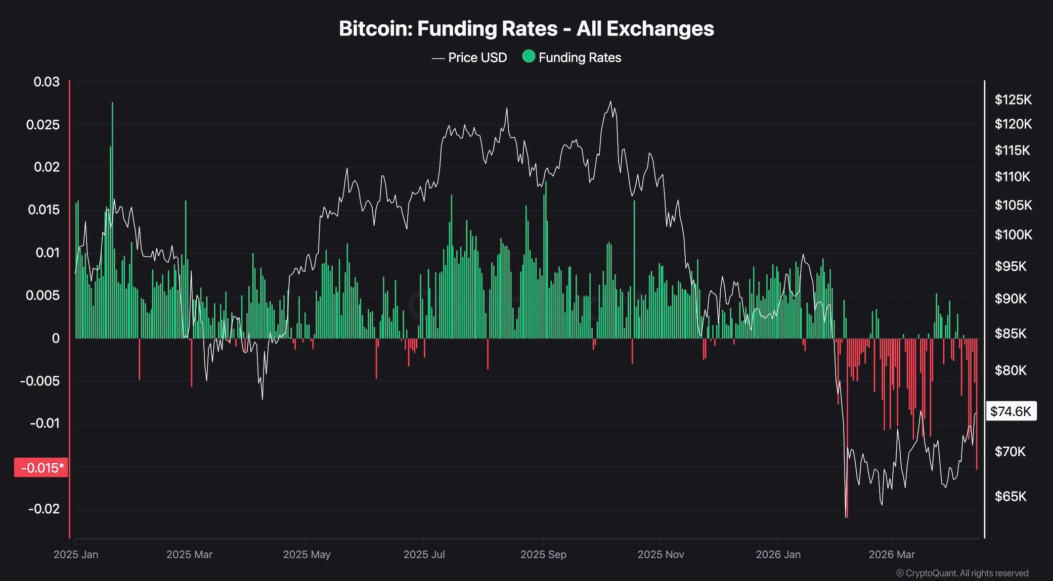 Despite the recent price recovery toward $74.6k, Bitcoin’s funding rates across all exchanges remain deeply negative — currently reading around -0.015 — and have shown no meaningful recovery since the downtrend accelerated in February. The chart tells a stark story, which is that after over a year of predominantly positive funding throughout the 2025 bull market, the shift to persistent negative territory has been both sharp and sustained. The red bars have been dominating virtually every reading across the past two months.