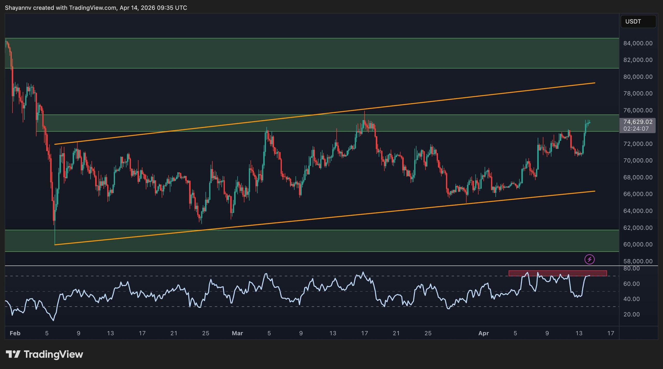 The $74k-$76k area is the most important short-term hurdle to clear. A convincing close above it would open a path toward the $80k–$82k supply zone and would represent a meaningful shift in short-term structure. However, if the price stalls and pulls back from here instead, the channel’s lower boundary near $66k becomes the first support level to defend, with the key $60k zone as the deeper reference below.
