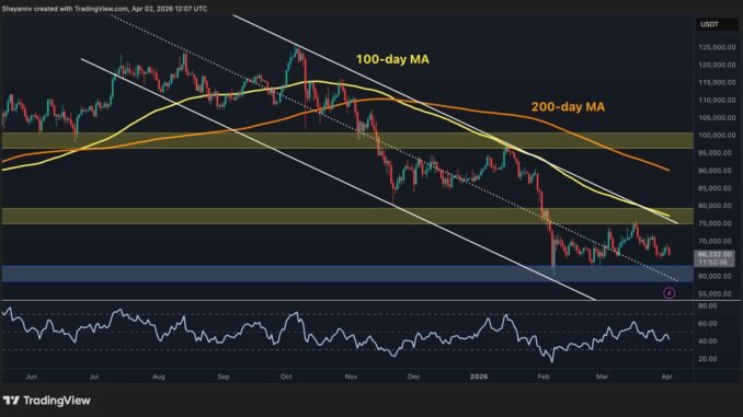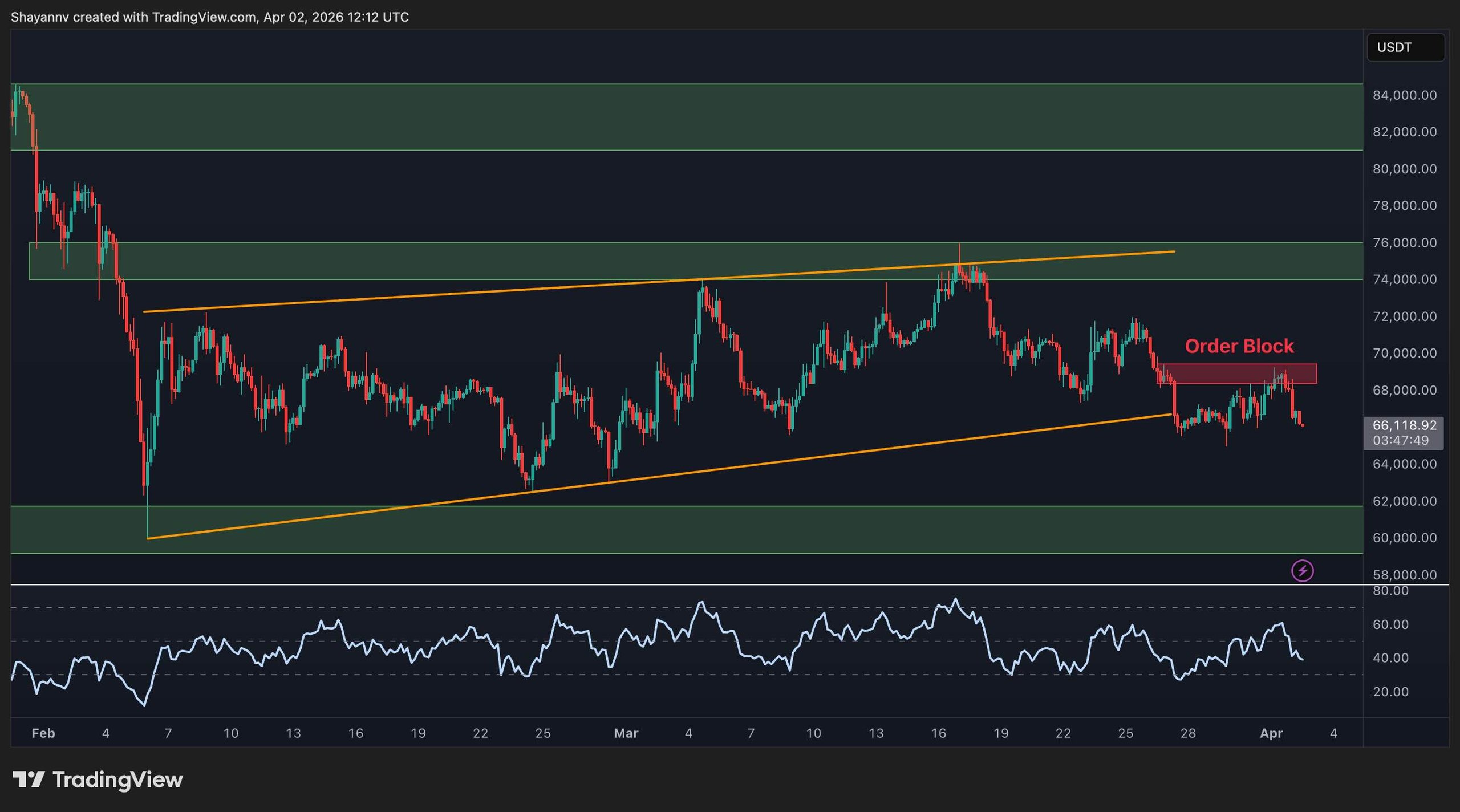 The price attempted to push back above the $75k zone in March, but failed decisively. The subsequent lower highs and lows formed signals that sellers are still in control, and are likely to push the asset back below the midline of the channel. This makes the critical support level at $64k vulnerable in the short-term, and a break below it could reopen the downside toward the next key level near $50k.