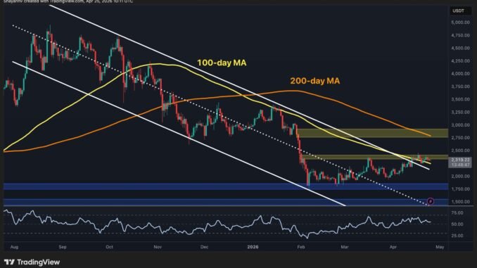 The 4-hour chart shows a sharper ascending trendline that has been guiding price since the late-March lows, now providing support near $2.3k. ETH is sitting directly on that trendline at the moment, having pulled back from the recent rejections at $2.4k. These rejections were accompanied by a bearish RSI divergence visible on the chart, where the price made a marginally higher high while RSI printed lower.