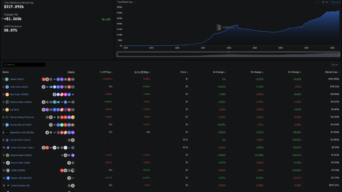 Total stablecoin market cap reached $317.89 billion as of April 2026, up from roughly $125 billion in early 2024.