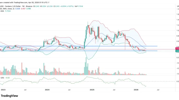 Cardano (ADA) continues to trade near a critical long-term support zone, even as the broader crypto market attempts to stabilise. On the weekly timeframe, ADA is trading within a well-defined range, with the lower boundary around $0.22–$0.26 acting as a key support zone. This level has been tested multiple times since 2023, making it a critical area for bulls to defend.
