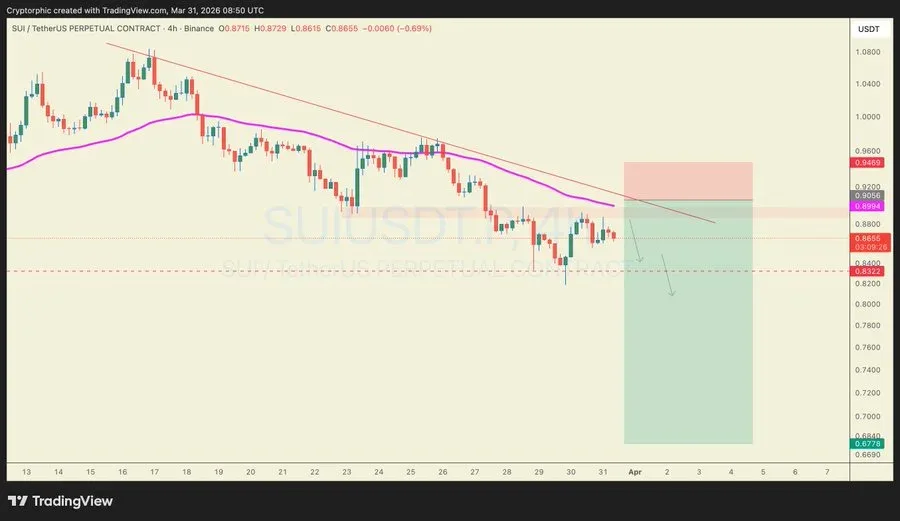 SUI is still facing sustained selling pressure as of March 31, 2026, with the structure of its prices showing a clear bearish trend. It is still trading below the relevant levels with falling volumes and weekly losses.