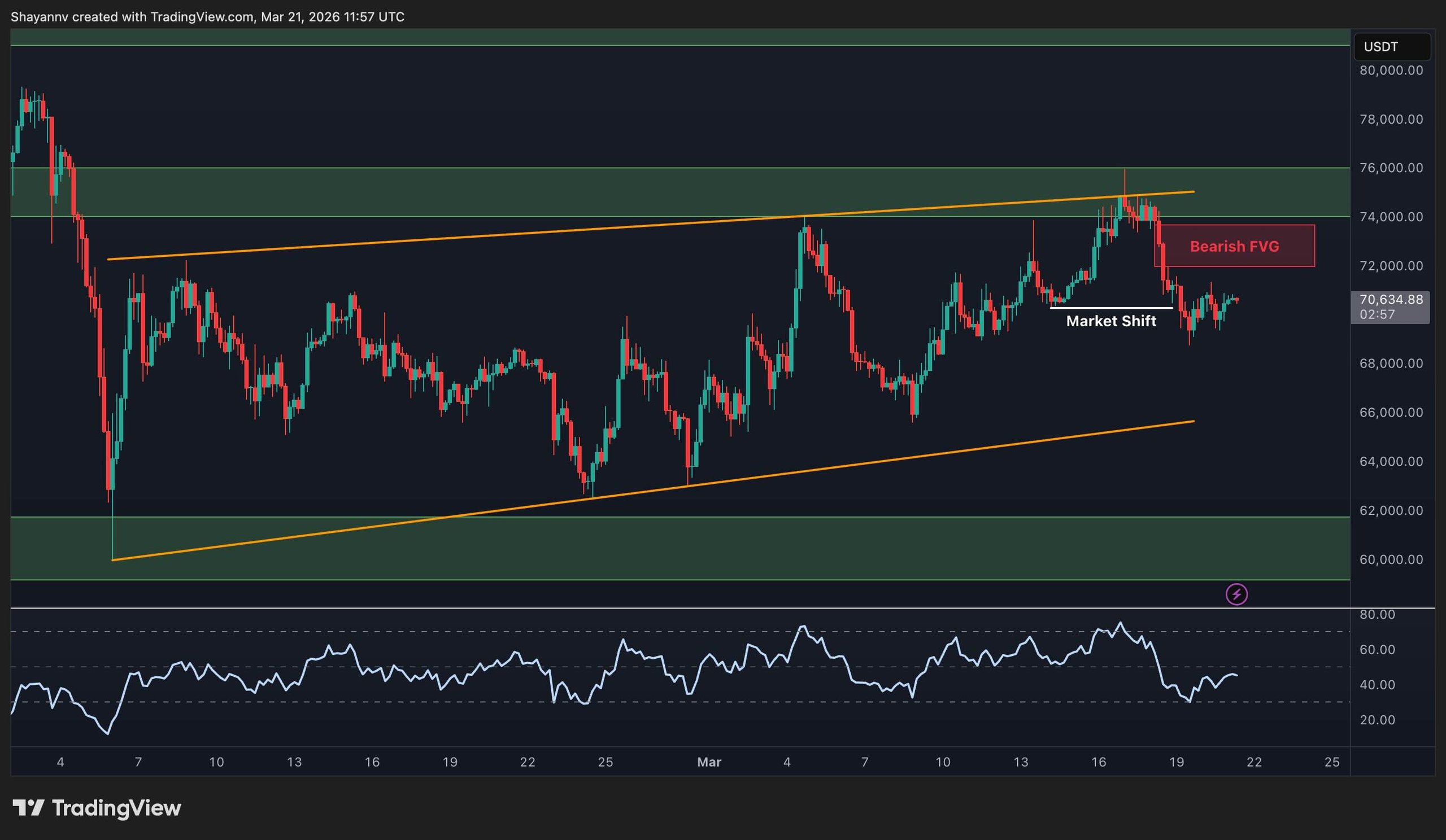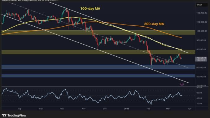 Bitcoin is still in recovery mode, but the pace has cooled as the price runs into a heavier resistance cluster in the low-to-mid $70,000s. The market has already bounced meaningfully from the February washout near $60,000, yet the latest price action shows that buyers are now being forced to prove they can do more than just rebound. So, this no longer seems like a simple relief rally zone, but an area where the structure needs follow-through.