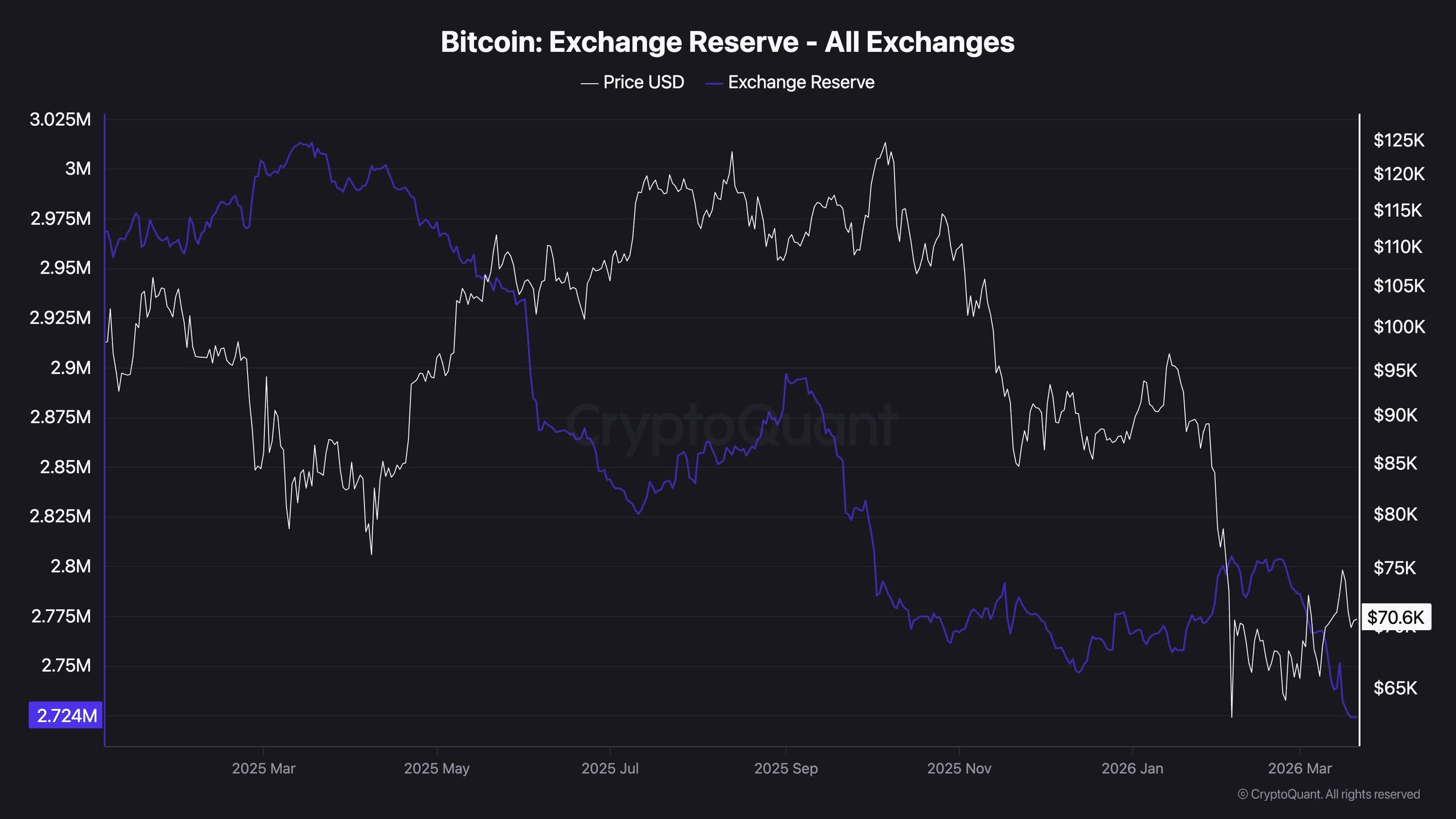 That is often a positive background signal because it suggests market participants are withdrawing BTC instead of positioning for immediate selling. The first few weeks of that reserve decline are especially important here, since they line up with the recent consolidating phase and imply steady spot absorption under the surface. So even though price is still dealing with technical resistance on the chart, the reserve trend suggests accumulation has been taking place in the background, which could support the market if buyers eventually manage to force a breakout.