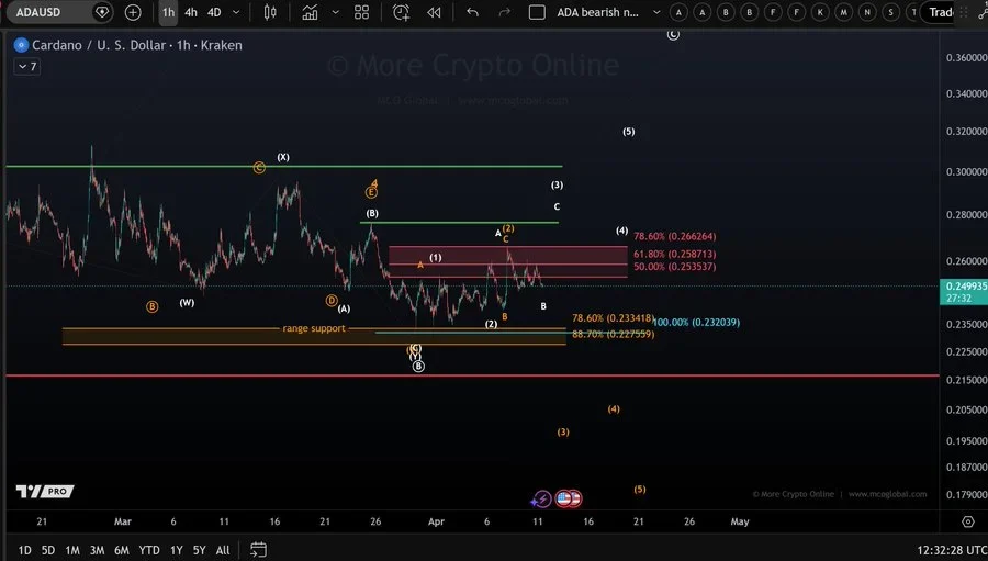 Analyst MCO Global highlighted that ADA continues to trade below the $0.266 resistance level. This level has capped recent upward attempts. The price movement from the March low remains overlapping. It does not show a clear impulsive structure.