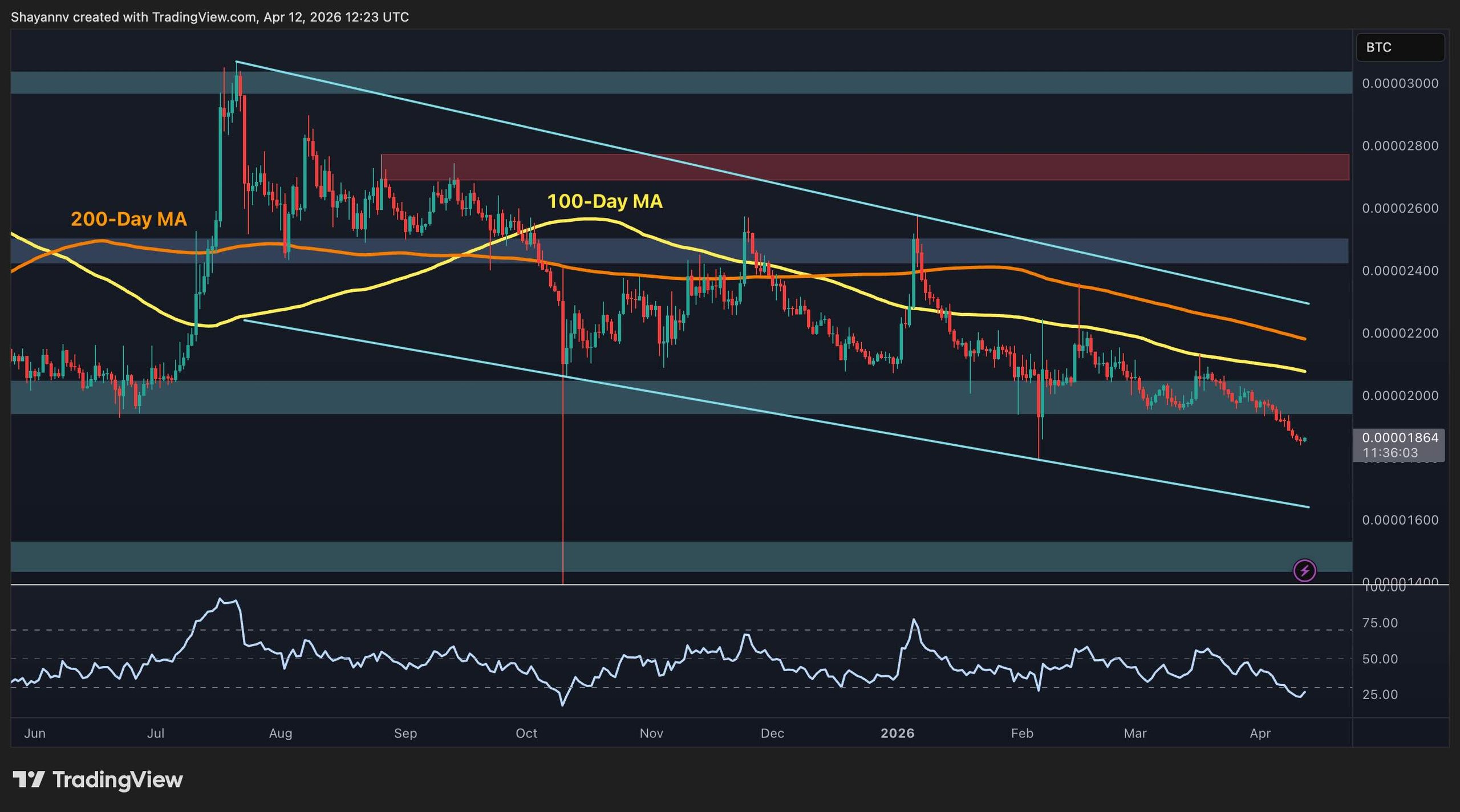 Both the 100-day MA (~2,100 sats) and 200-day MA (~2,200 sats) remain well overhead and declining, and the descending channel structure has been intact since the August 2025 peak near 3,000 sats. The RSI has dropped to the low-to-mid 20s (deeply oversold territory), which could spark a short-term technical bounce, but oversold readings alone are not sufficient to reverse a trend this entrenched.