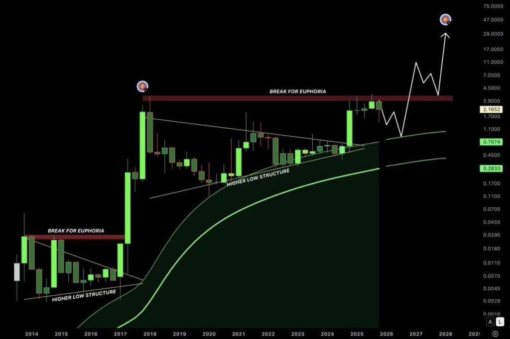 Furthermore, analyst ChartNerd pointed out that a deeper pullback toward the $0.70–$0.80 range could still occur before a larger rally unfolds.