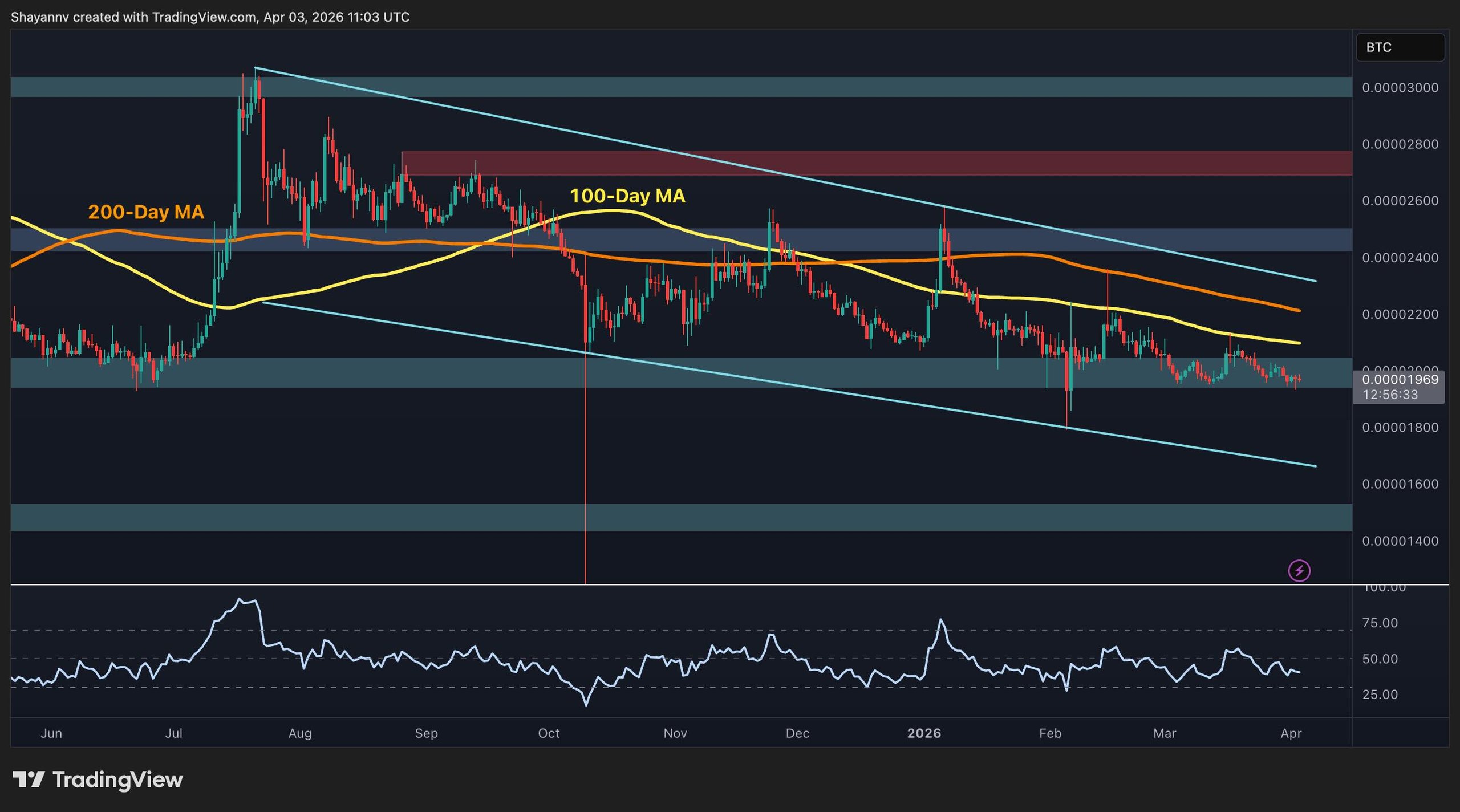 On the daily chart of the XRP/BTC pair, XRP is hovering near 1,970 sats. It is currently testing the 1,950-2,000 sats support zone, which has held the price on multiple occasions over the past few months. As with the XRP/USDT pair, the key 100-day and 200-day moving averages are located above the current market price and will act as dynamic resistance levels around 2,100 and 2,200 sats. With the market also trending lower inside the broad descending channel, the overall market structure is still bearish.