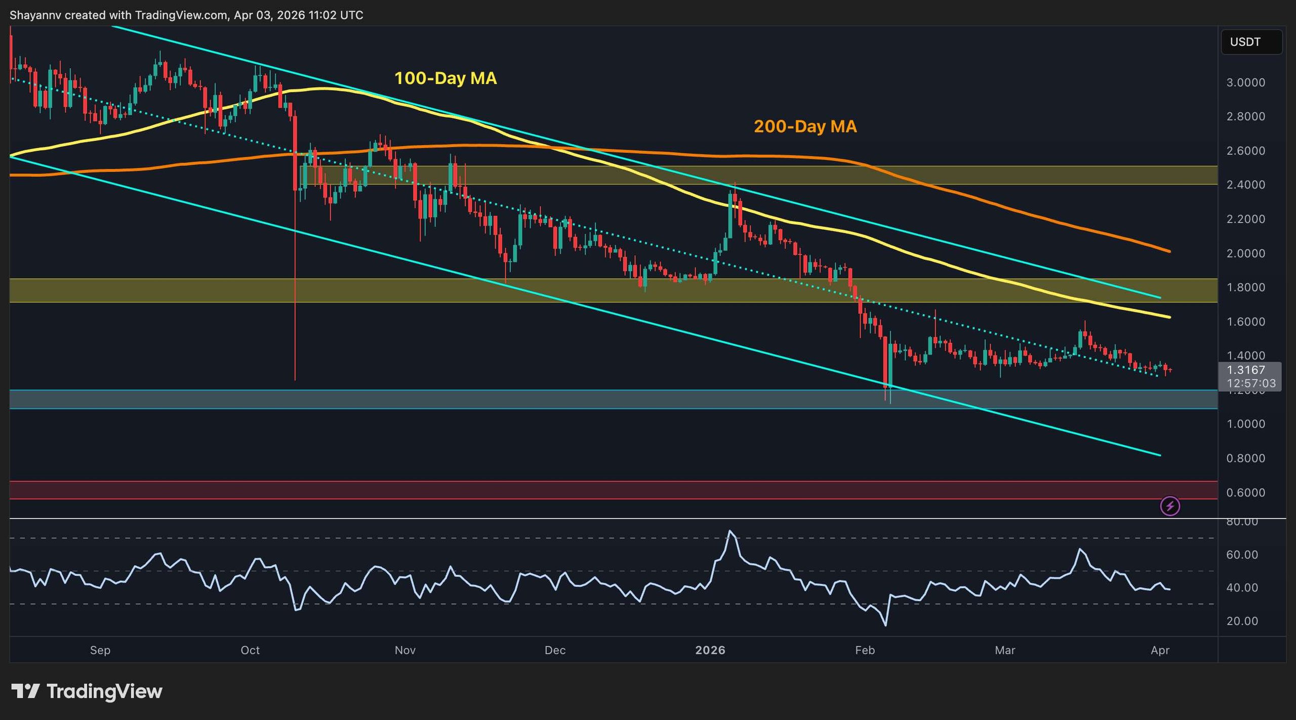 The resistance zone around $1.75 to $1.80 continues to cap upside. A move above that area would be needed to validate a broader bullish attempt, accompanied by a breakout above the large descending channel and the key moving averages. Yet, if this scenario fails, a breakdown below the $1.20 support zone would be expected, which could lead to a prolonged bear market in the coming months.