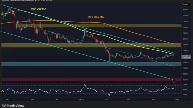 After spending the better part of Q1 2026 grinding sideways near the lows, XRP has quietly built a modest recovery setup. The asset is currently pressing against the upper boundary of the descending channel that has governed the price action since the October 2025 peak near $3.00, and for the first time in several months. The RSI has been hovering above 50, signaling that buyers are showing up with slightly more conviction than before.