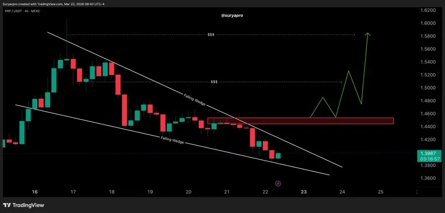 Crypto analyst Surya highlighted that XRP is still in compression in its 4-hour falling wedge chart. The token is trading in a range of $1.38 to $1.40, while its major resistance is in the range of $1.44 to $1.46.