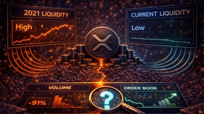 An Arab Chain report tracking XRP’s liquidity structure on Binance has identified a condition that reframes the current price action from both directions simultaneously. The liquidity index has fallen to approximately 0.053 — its lowest reading since 2021 — while the 30-day trading volume has contracted to approximately 3.77 billion XRP, one of the lowest levels recorded in recent years. The market is operating with a fraction of the participation that characterized XRP’s most active periods.