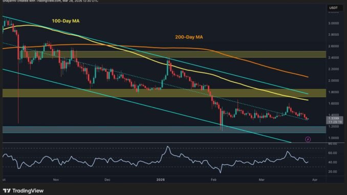 On the XRP/USDT chart, the asset is trading around $1.34. The price is just above the $1.20 support zone that has held recent lows. While there is a mild recovery attempt, XRP remains confined inside the descending channel and below both the 100-day and 200-day moving averages, located around the $1.80 and $2.10 levels, respectively. This still keeps the overall structure bearish.