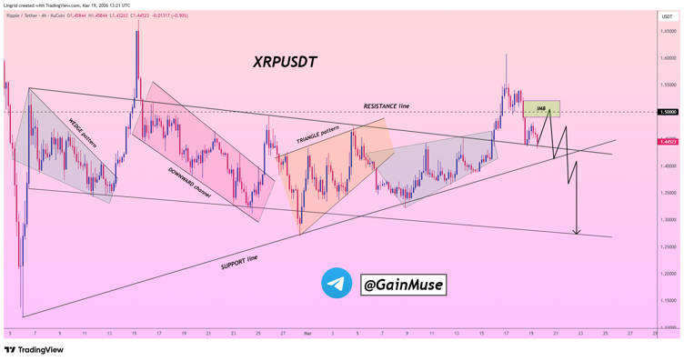 Market analyst GainMuse notes that XRP is struggling to break through the key $1.50 resistance, with recent price action signaling clear buyer hesitation. The altcoin briefly pushed into this upper range but failed to sustain momentum, retreating quickly, a classic sign of rejection at a critical level.