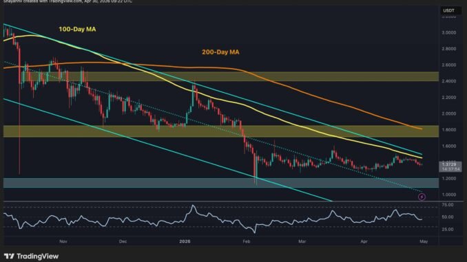 The 100-day MA at ~$1.50 and the 200-day MA converging with the $1.80 supply zone remain the levels that define the ceiling. Neither was seriously threatened lately. On the support side, the February wick low at $1.20 remains the hard floor. A close below this level would suggest XRP is now tracking toward the lower channel boundary rather than building for another breakout attempt, and would put the critical $1 support zone back in active focus heading into May.