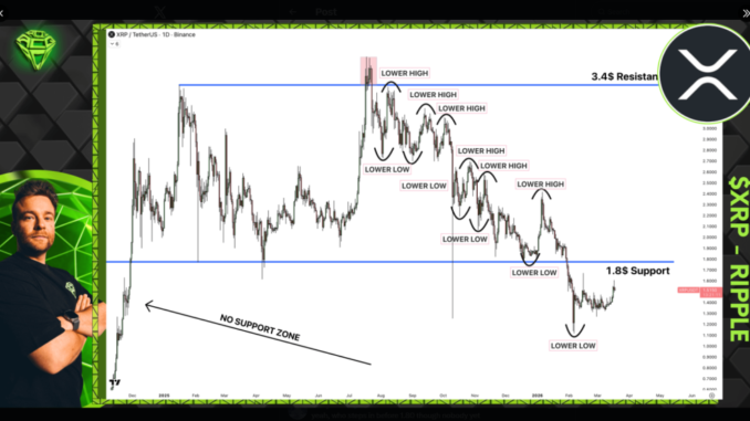 A price zone that held as a floor throughout all of 2025 is now blocking XRP from recovering. The $1.80 level — once a reliable support — flipped to resistance in January 2026, and the token has not come close to reclaiming it since. Until it does, one analyst says XRP remains “in deep trouble.”