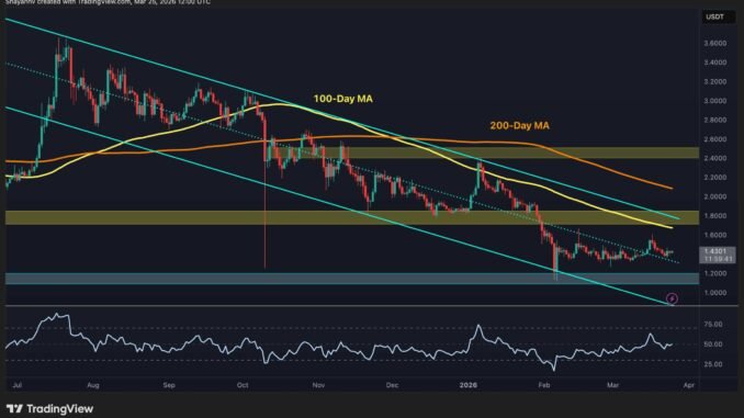 XRP is trading around $1.43, still deep in a correction that has erased the majority of its bull market gains. With both moving averages trending downward and the price trapped inside a descending channel, the altcoin continues to underperform against broader market expectations as Q1 2026 draws to a close.